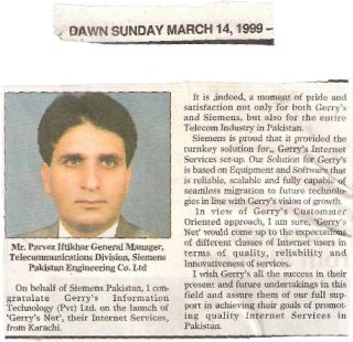 March 14,1999 On behalf of Siemens Pakistan, I congratulate Gerry’s Information Technology (Pvt) Ltd. on the launch of ‘Gerry’s Net’, their Internet Services, from Karachi. Please Click Here to continue reading.