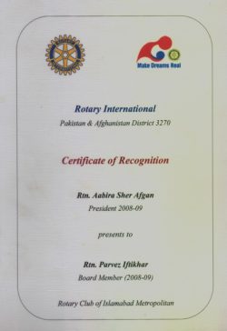 Certificate of Recognition by Rotary Club of Islamabad Metropolitan