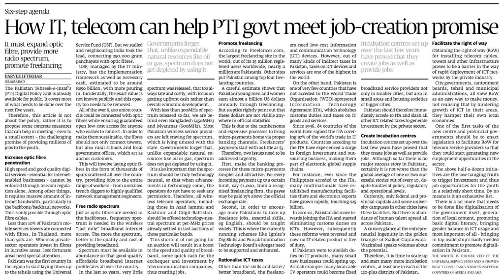 The Express Tribune: How IT, telecom can help PTI govt meet job-creation promise, 27 August 2018